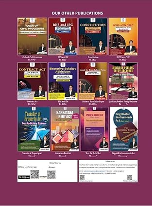 Subjects covered: 1. Indian Constitution 2. CPC, 1908 3. CrPC, 1973 & BNSS, 2023 4. IPC, 1860 & BNS, 2023 5. IEA, 1872 & BSA, 2023 6. Indian Contract Act, 1872 7. Transfer of Property Act, 1882 8. Specific Relief Act, 1963 9. Negotiable Instruments Act, 1881 Highlights Marked Important Sections 1000+ One liners, Illustrations , Caselaws & others Quick Bird’s-Eye View of Each Chapters Simplified Charts & Tables for Conceptual Clarity Memory-Based Approach for Easy Retention